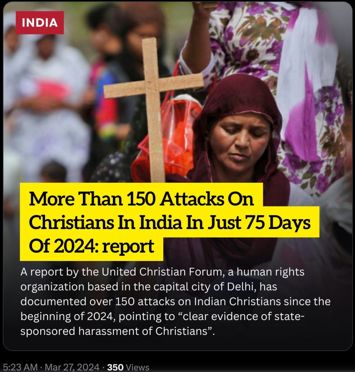 India ranked 11th on Christian support organization Open Doors’ 2024 World Watch List of the countries where it is most difficult to be a Christian. The country was 31st in 2013, but its position worsened after Modi came to power.
